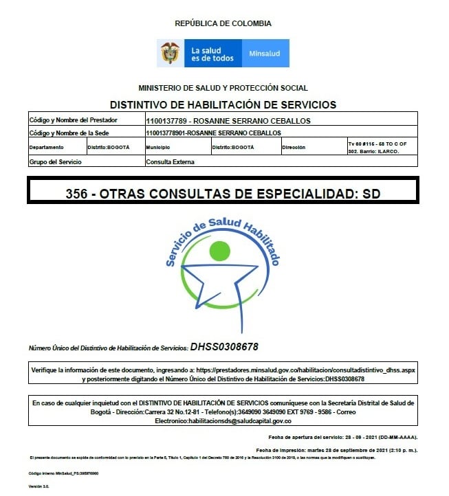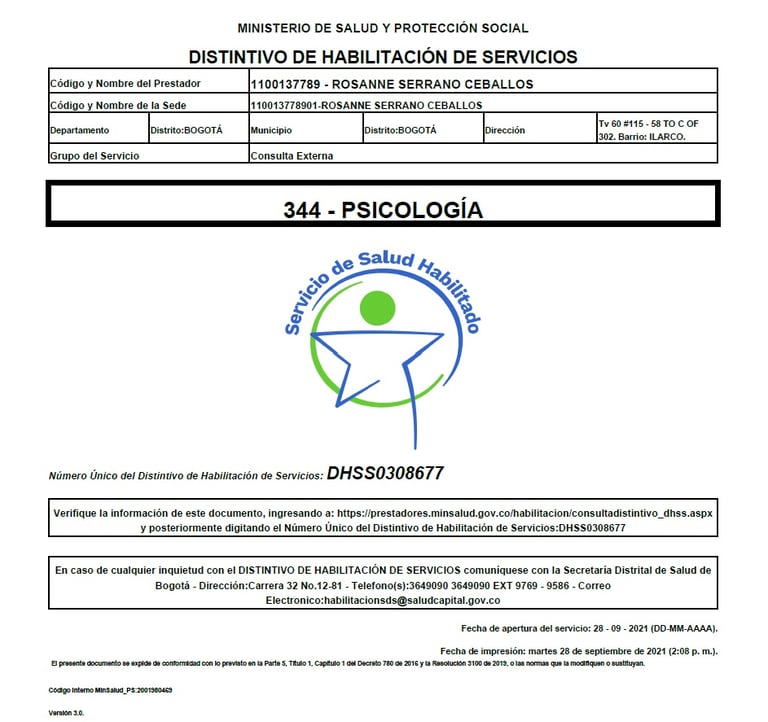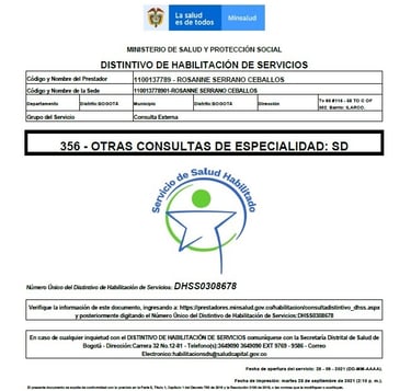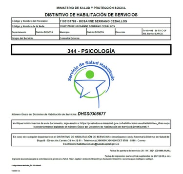 Estas habilitaciones certifican que el consultorio cumple con los estándares exigidos en infraestructura, condiciones locativas, procesos asistenciales, manejo de la información, confidencialidad y calidad en la atención al usuario. De esta manera, se garantiza un espacio seguro, adecuado y profesional para la atención psicológica de adultos. La atención en psicología clínica se realiza en un entorno ético, confidencial y respetuoso, orientado al cuidado de la salud mental y al bienestar emocional. La formación profesional y la experiencia clínica respaldan cada proceso terapéutico, brindando a los pacientes la tranquilidad de recibir atención psicológica en un consultorio legalmente habilitado en Bogotá.